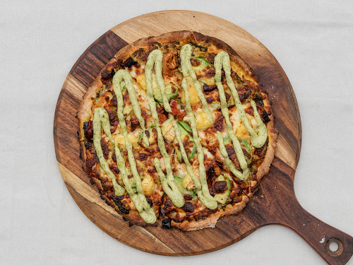 Basil Pesto Base, Mozzarella Cheese, Finely Sliced Chicken Fillets, Sliced Avocado, Semi Dried Tomatoes, Brie Cheese, topped Pesto Aioli & Fresh Basil
