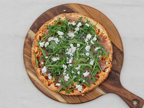 Basil Pesto Base, Mozzarella Cheese, Semi Dried Tomatoes, Red Onions, Feta Cheese & Kalamata Olives topped with Rocket & Roasted Pine Nuts