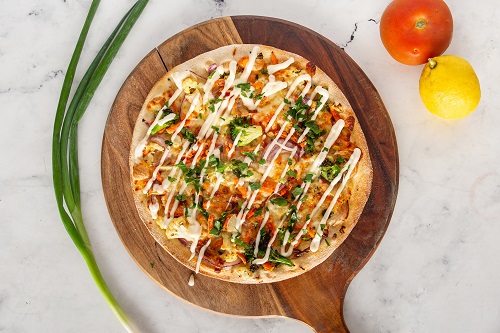 Extra Virgin Olive Oil, Mozzarella Cheese, Parmesan Cheese, Brie Cheese, Freshly Roasted Broccoli, Cauliflower, Carrots, Red Onions, topped with Garlic Aioli & Parsley